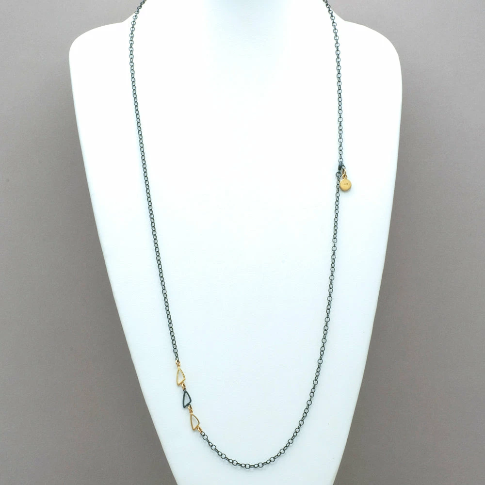 Oxidized sterling silver chain with 22K gold and oxidized triangular links. Design meaning: Triangle: The Divine, Immortality, Power, Safety, Success and Prosperity. Adjustable up to 37″ long.
