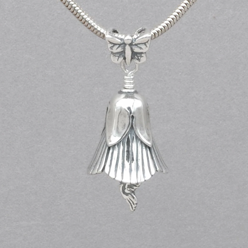 Handcrafted in Sterling Silver, the petals form the bell body a butterfly forms the bail and the clapper is a hummingbird. Measures 1 1/4″ long. bc jj034