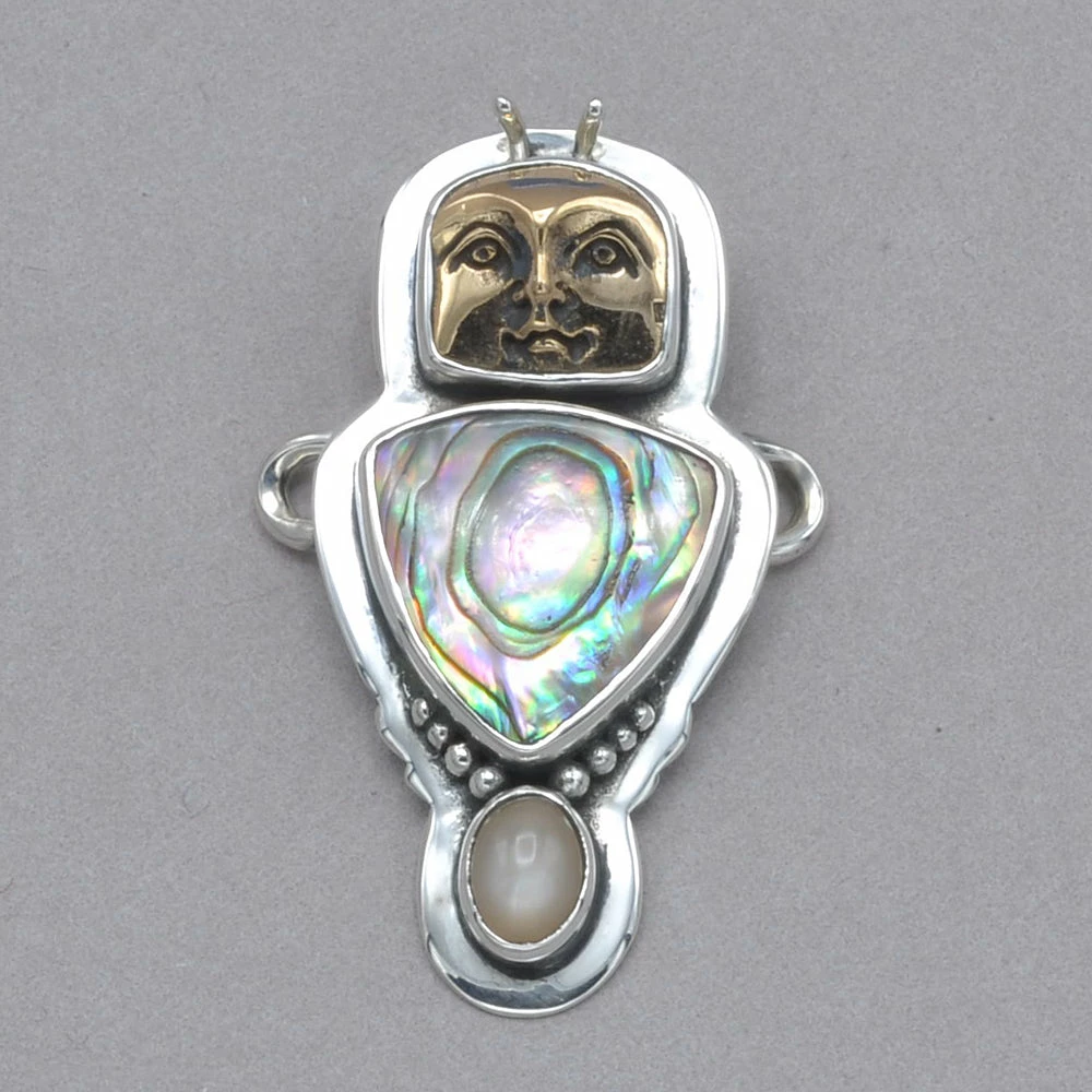 Bronze bug goddess face with an abalone body and accented by moonstone and graduated sterling silver beads set in sterling silver. Tabra charms are used to fasten Tabra connector chain. 1″ long with a 3/4″ hook length. ti dc99