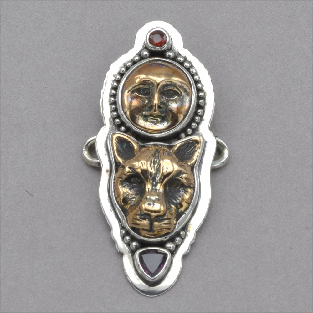 Bronze Jaguar and moon face accented with 2 faceted gadgets, surrounded with beads set in sterling silver. Tabra charms are used to fasten Tabra connector chain. 1 7/8″ long with a 7/8″ hook length. ti dc101