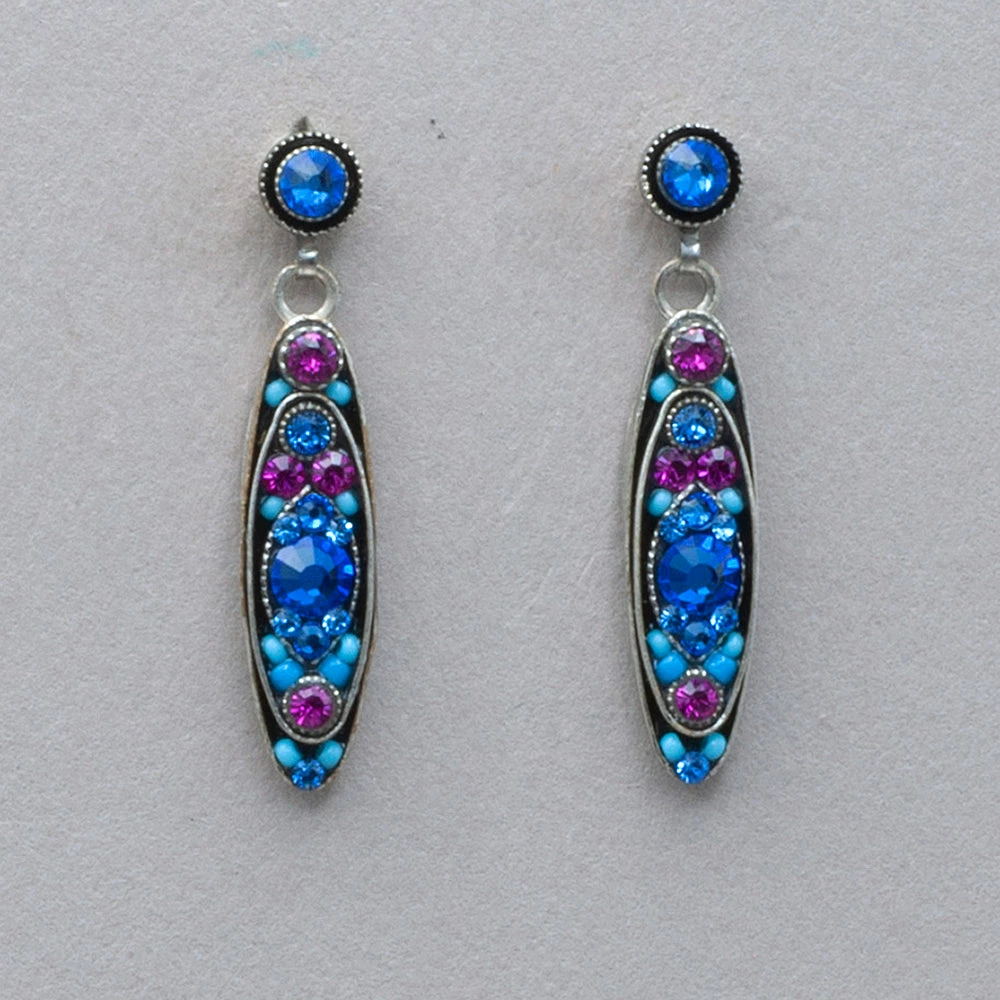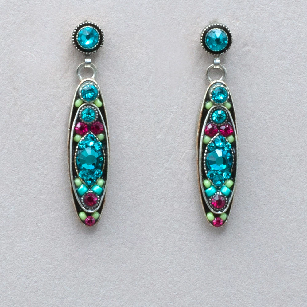 Made in Guatemala, these intricately embellished mosaic earrings are comprised of European crystals and glass beads. Sterling silver ear wires. Measures 1 1/16″ long, 1/4″ wide. ff e184p