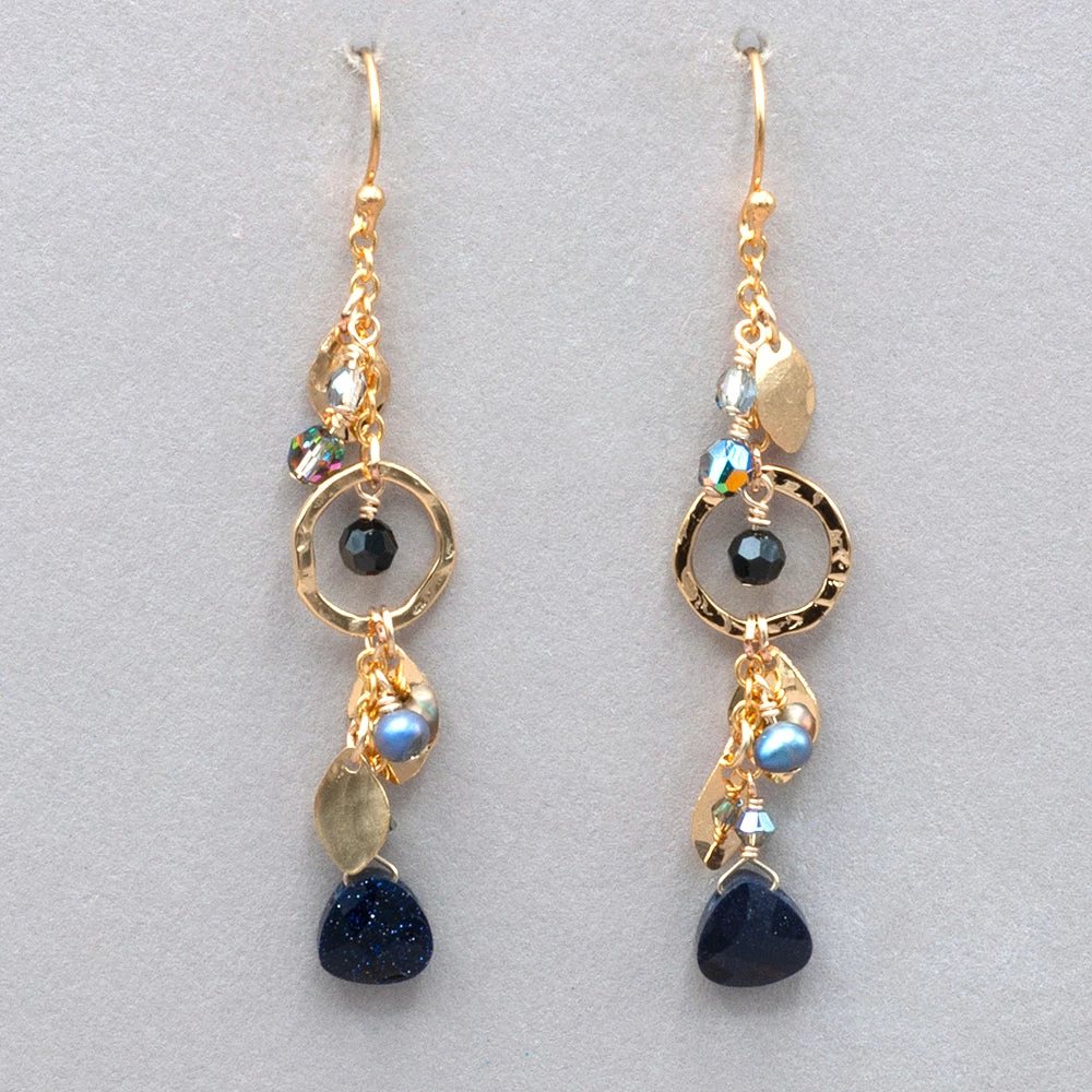 Get spirited away to a fanciful world of charm and wonder. Featuringย a delicately hammered ring of precious metal with a sprinkling of colored beads, glimmering gemstones, and twinkling crystals drip with color, texture, and light from shimmering dainty chain. Quartz and peridot or crystal glass andย apatite, with freshwater pearls, Swarovski crystal, and bohemian glass.ย Silver overlay or gold overlay with sterling silver or gold overlay ear wires. Measuresย 2 1/2″ L x 1/2″ W.