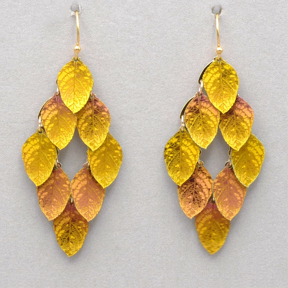 Chic and sophisticated, our Samantha Earrings offer a touch of Bohemian flair with their modern chandelier shape. Miniature leaves are hand colored in an ombre style reminiscent of the way the light shades a wooded path throughout the day. A unique eye-catching look for the free-spirit. Gold and silver overlay or niobium on gold overlay ear wires. Measures 2 3/4″ long by 1 1/8″ wide.