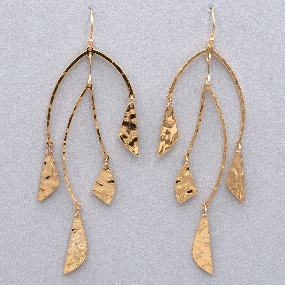 South Beach EarringsΒ are mobiles for the ears. Abstract shapes of niobium or hammered gold hang and rotate in perfect balance from free-swinging hammered supports. Measures:Β 3 5/8″ l. x 1 1/4″ w.Β FUN!
