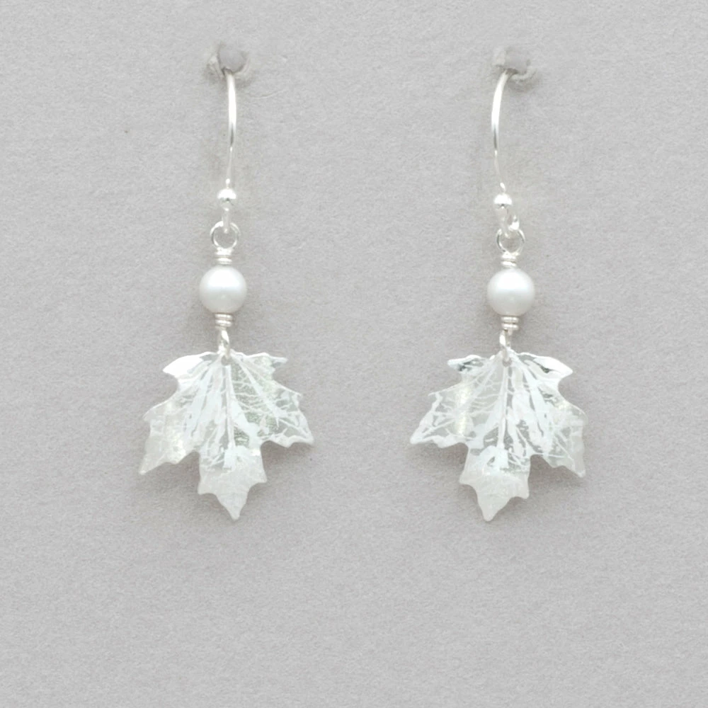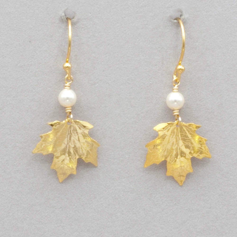 A fresh take on a favorite motif, this dainty design features delicate coloring, detailed patterns and cutwork, and a subtly hand-hammered finish. Our Sugar Maple Earrings are perfect for nature lovers and to wear as a symbol of strength, beauty and inner sweetness. Niobium, gold overlay, or silver overlay with bohemian glass or Swarovski crystal pearls on gold overlay or silver overlay ear wires. Measuresย