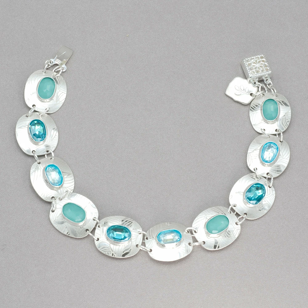 Featuring an art-deco inspired motif, this lightweight and ultra-wearable bracelet features hand-set gemstones for an absolutely radiant effect. Peridot, garnet, or faceted glass, set in gold fill or sterling silver. Measures 7 1/2″ long.