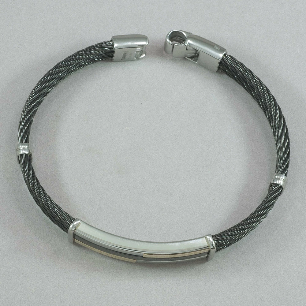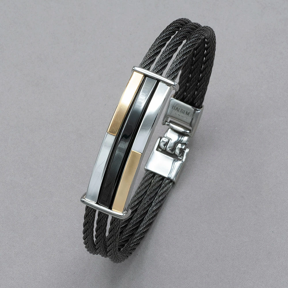 18K yellow gold with stainless steel and black ion-plated 3-row cable bracelet. Measures about 8.5″ long. Made in Italy. ital smbg39