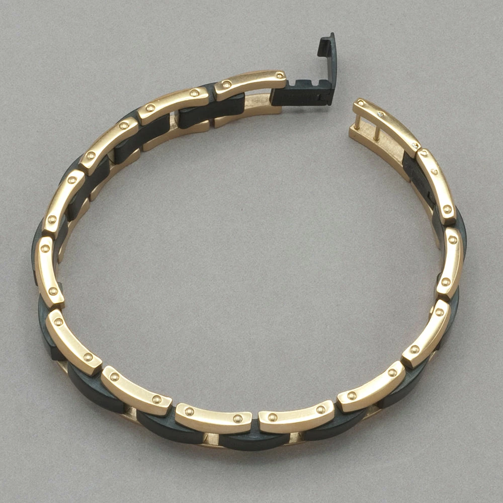 Brushed black ion-plated stainless steel center links with yellow ion-plated stainless steel edges. Adjustable, measures on average about 8.5″ long. ital smb108