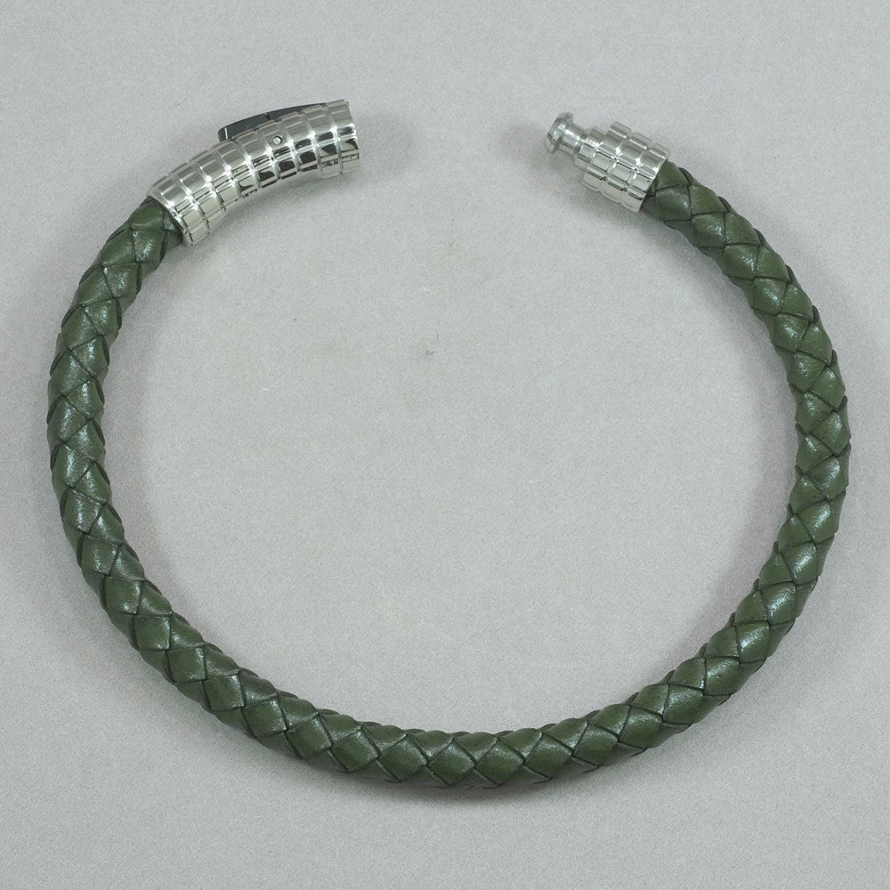 Green leather bracelet with stainless steel clasp. Measures 8.5″ around. ital slb 274