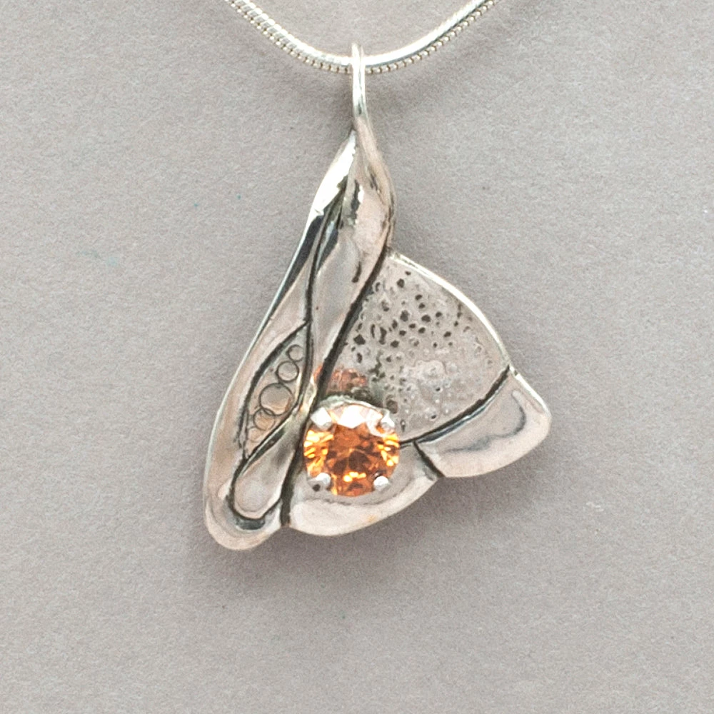 Free form hand chased sterling silver pendant set with a champagne colored cubic zirconia. Measures 1 1/4″ long X 1″ wide. jk p381