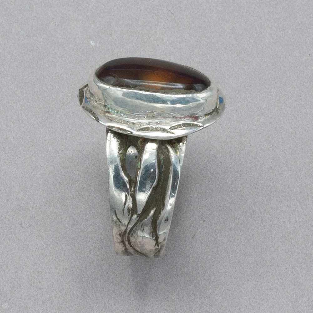 Mexican fire agate set in hand-chased sterling silver on a sterling silver ring band. jk rg239