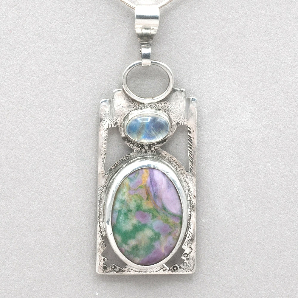 Pendant of pink and green Monet stone accented with an oval blue flash moonstone is set in textured polished sterling silver. Measures 2 7/8″ long x 1 1/8″ wide. One of a kind. jk p382