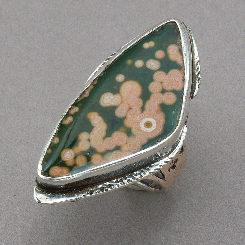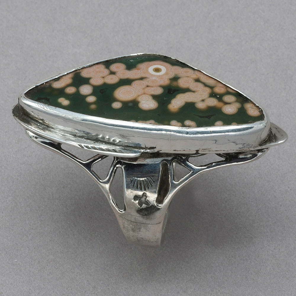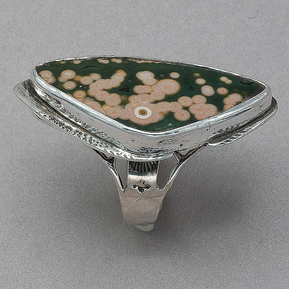 Ocean jasper set in embossed sterling silver on a sterling silver ring band. jk rg236
