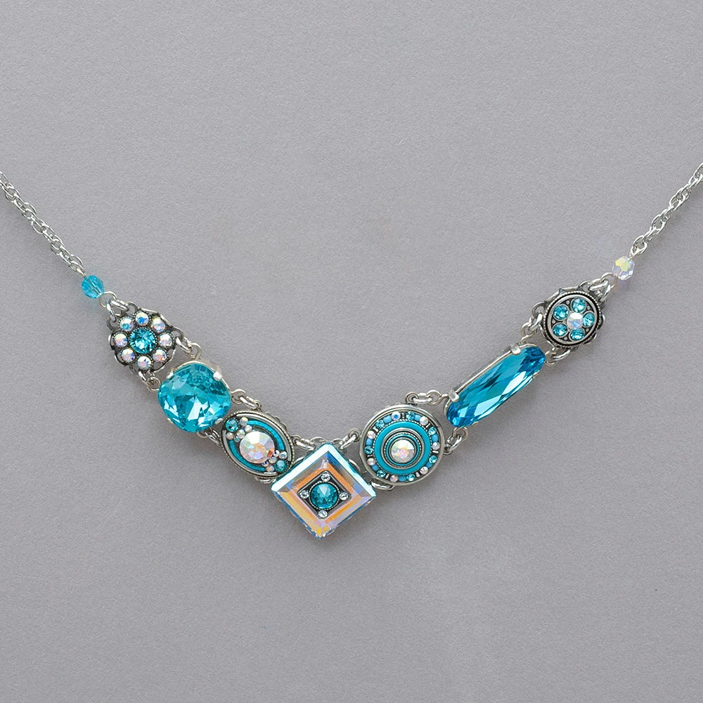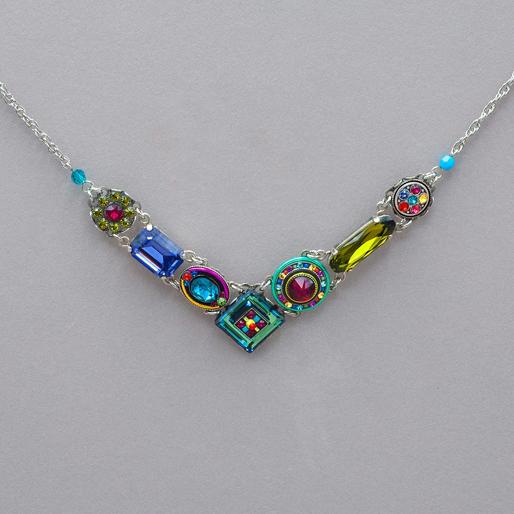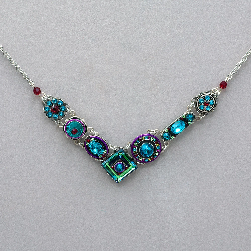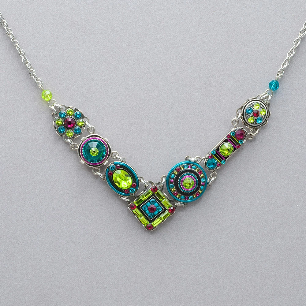 Made in Guatemala, this beautiful necklace comprises Swarovski crystals and various other materials in an intricate mosaic design. Lobster clasp. Necklace adjustable from 15 1/2″ to 17″ long. ff 8411