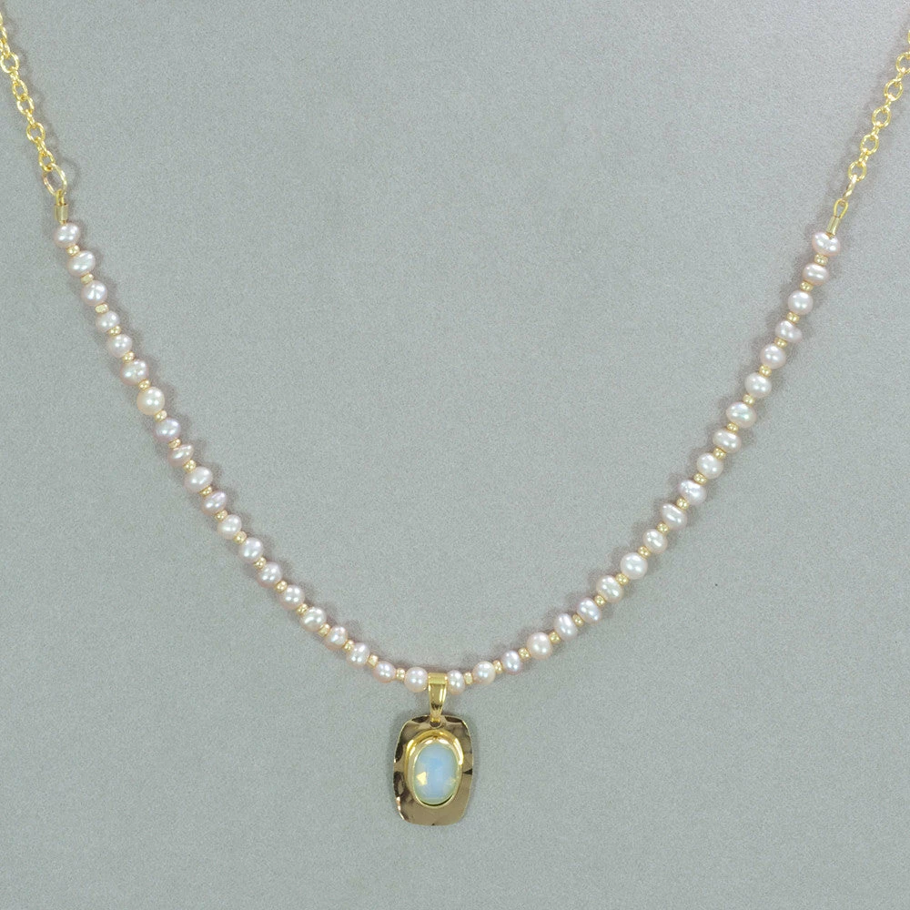Faceted glass set in gold overlay with freshwater pearls on a gold overlay chain. Adjustable 18-20″ long.