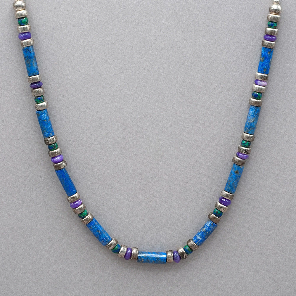 Denim lapis, sugilite, azurite and sterling silver beads. Measures 16″ long. mb n200