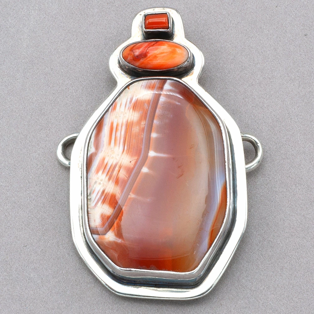 Caramel colored agate with red coral and spiny oyster shell accents set in sterling silver. Tabra charms are used to fasten Tabra connector chain. 2″ long with a 1 3/8″ hook length. rbj ch2003