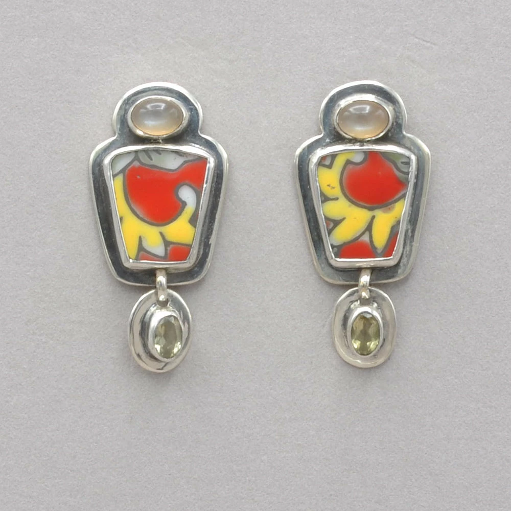 Chinese pottery shard with yellow and bright red flower motif, topped with yellow moonstone and petite citrine dangles set in sterling silver on sterling silver posts. Measures 1 5/8″ long, 5/8″ wide. ti de61
