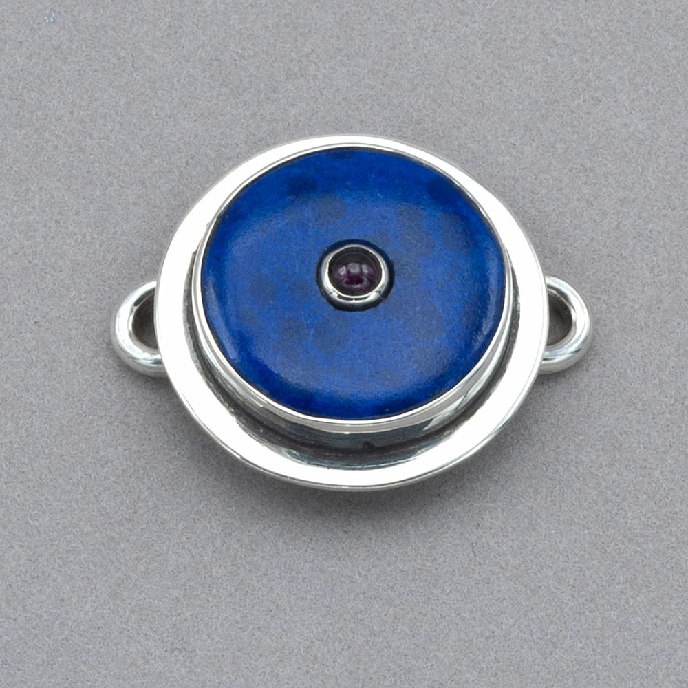 Small lapis donut with a tiny cabochon garnet set in sterling silver. Tabra charms are used to fasten Tabra connector chain. 3/4″ long with a 7/8″ hook length. ti no23